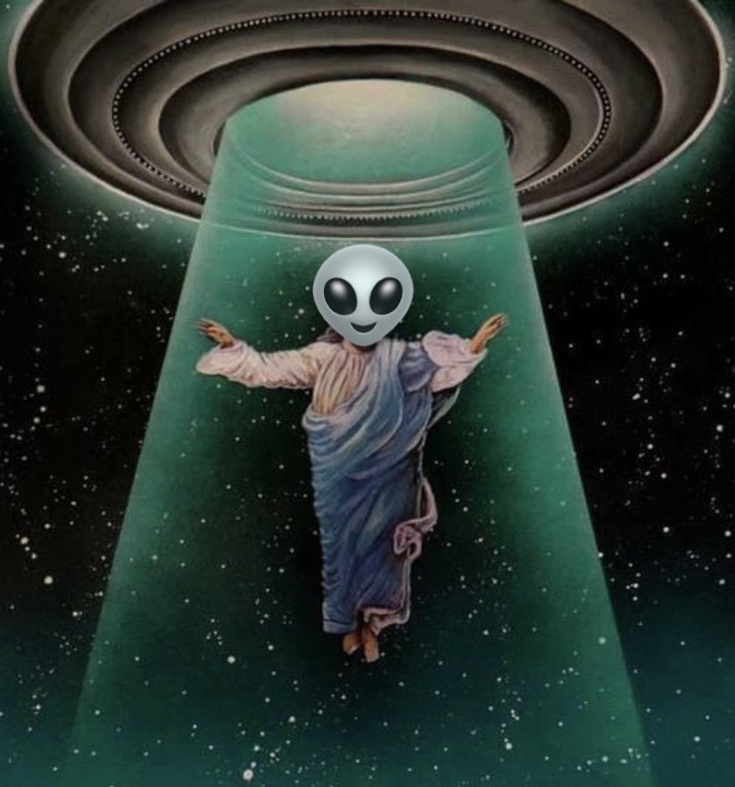 Mientras decía esto señalaba el cielo, encima suyo flotaba la imagen de un ser verde, cuya cabeza era desproporcionada, más grande en la parte del cráneo y sus ojos eran rasgados con las pupilas completamente negras.